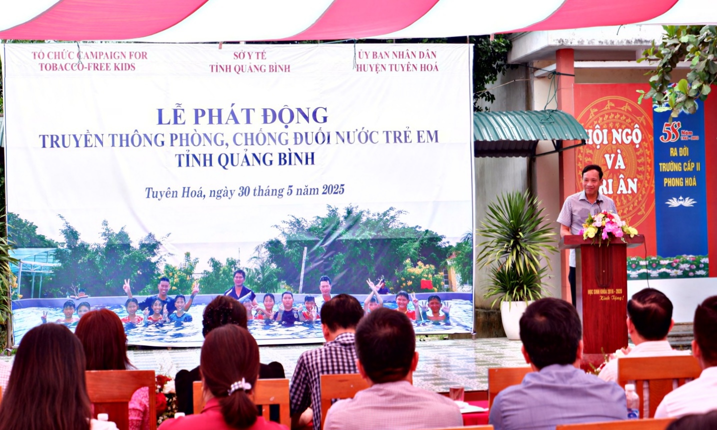 Chiều ngày 27/5, tại Trường THCS Phong Hóa, Sở Y tế phối hợp với UBND huyện Tuyên Hóa tổ chức Lễ phát động truyền thông phòng, chống đuối nước trẻ em năm 2025. Buổi lễ có sự tham dự của đại diện lãnh đạo các sở, ban ngành gồm Sở Y tế, Sở Văn hóa, Thể thao và Du lịch, Sở Giáo dục và Đào tạo, Tỉnh Đoàn, UBND huyện Tuyên Hóa, cùng các trường THCS trên địa bàn huyện và đông đảo giáo viên, học sinh Trường THCS Phong Hóa.