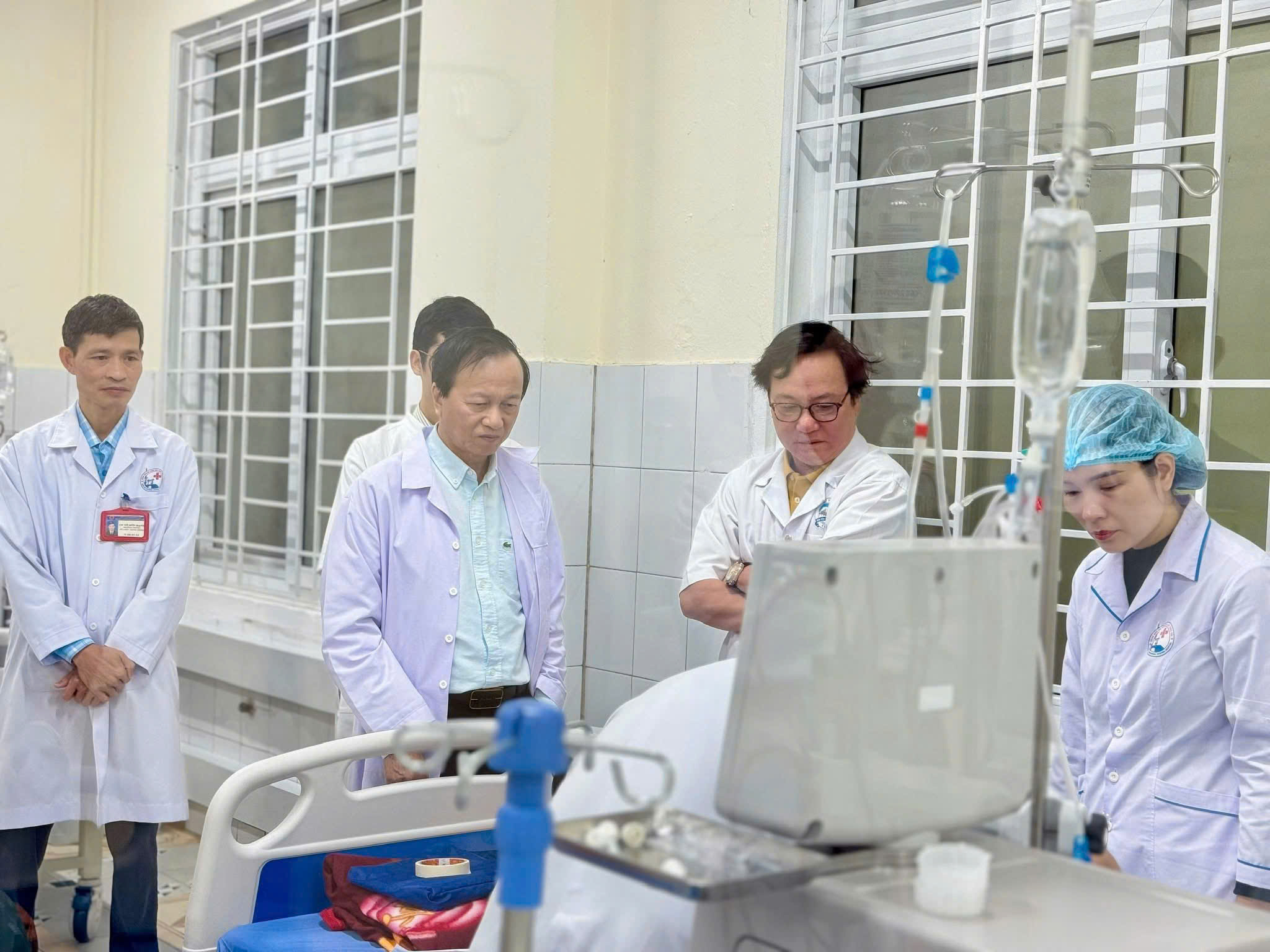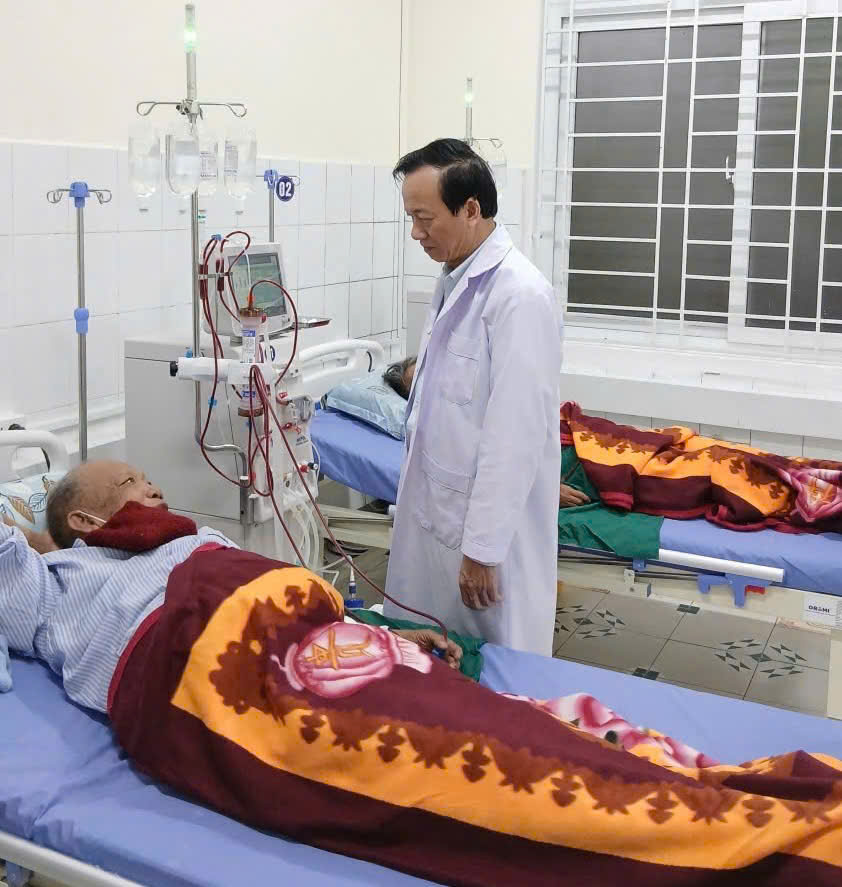 Bác sĩ Đỗ Văn Hùng, Phó Giám đốc Sở Y tế Quảng Trị thăm hỏi, động viên bệnh nhân chạy thận nhân tạo.