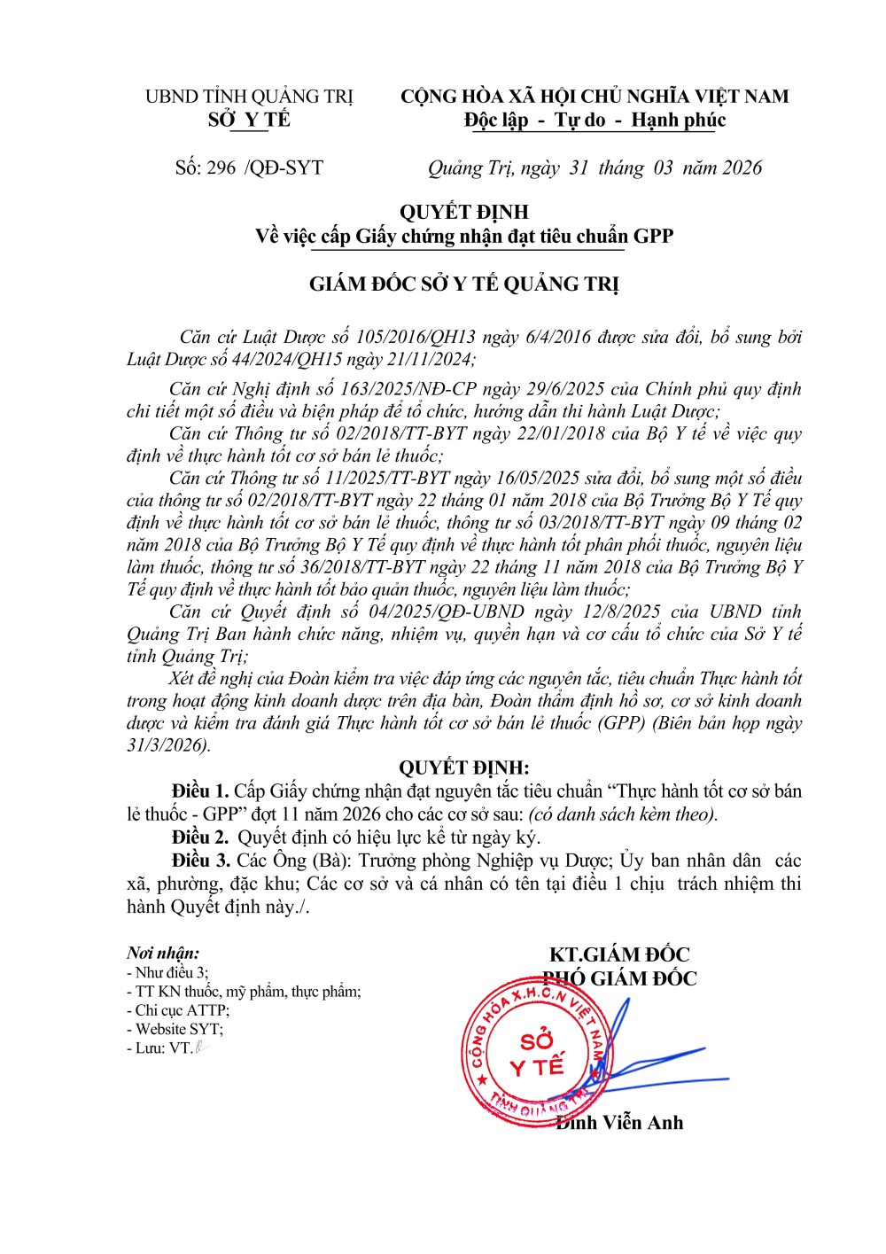 - Thông báo cơ sở đáp ứng thực hành tốt bảo quản thuốc, nguyên liệu làm thuốc (GSP) (01-07-2025)