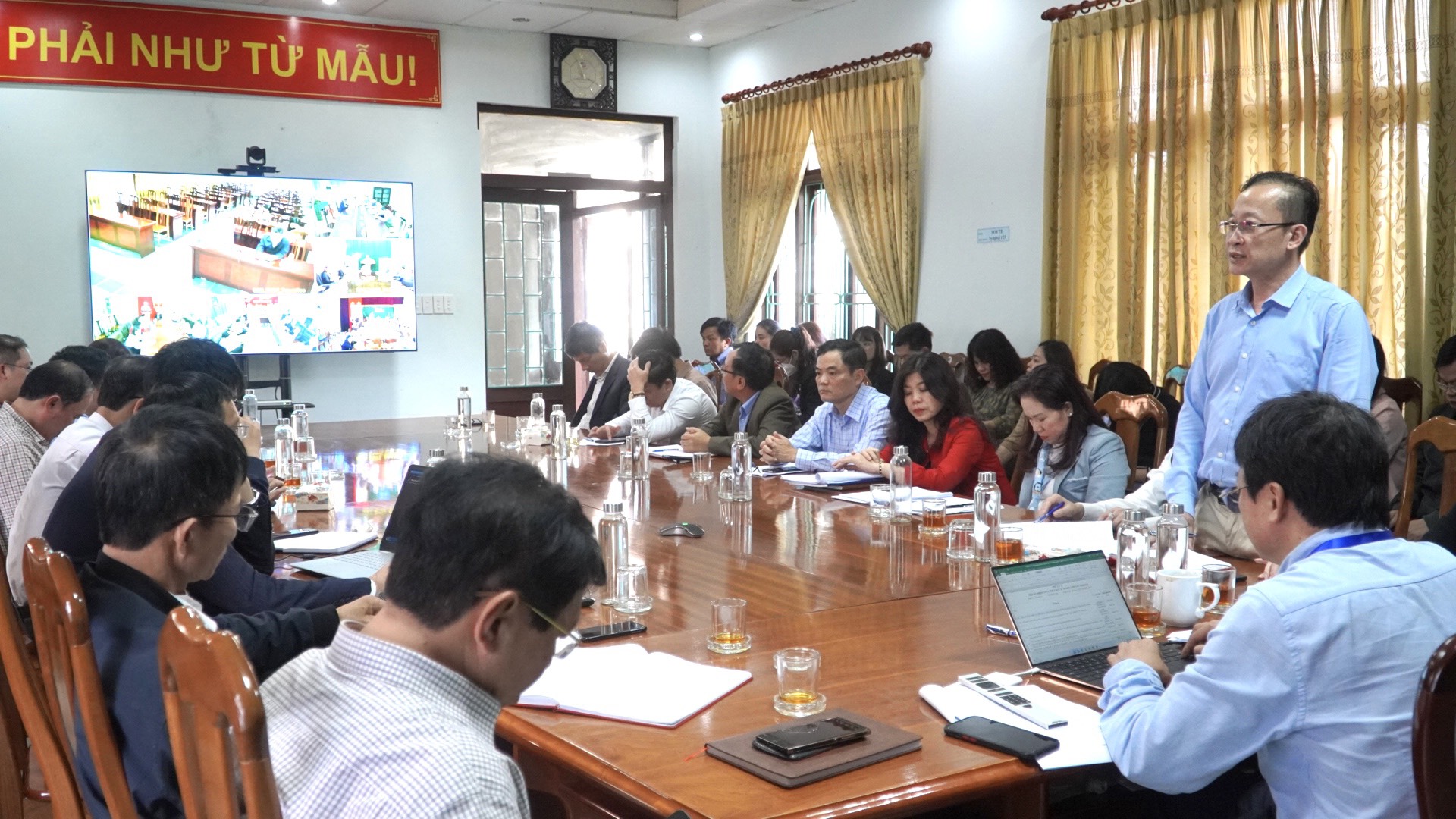 Các đại biểu tham dự tại điểm cầu Sở Y tế và hình ảnh các đầu cầu tại tuyến huyện.