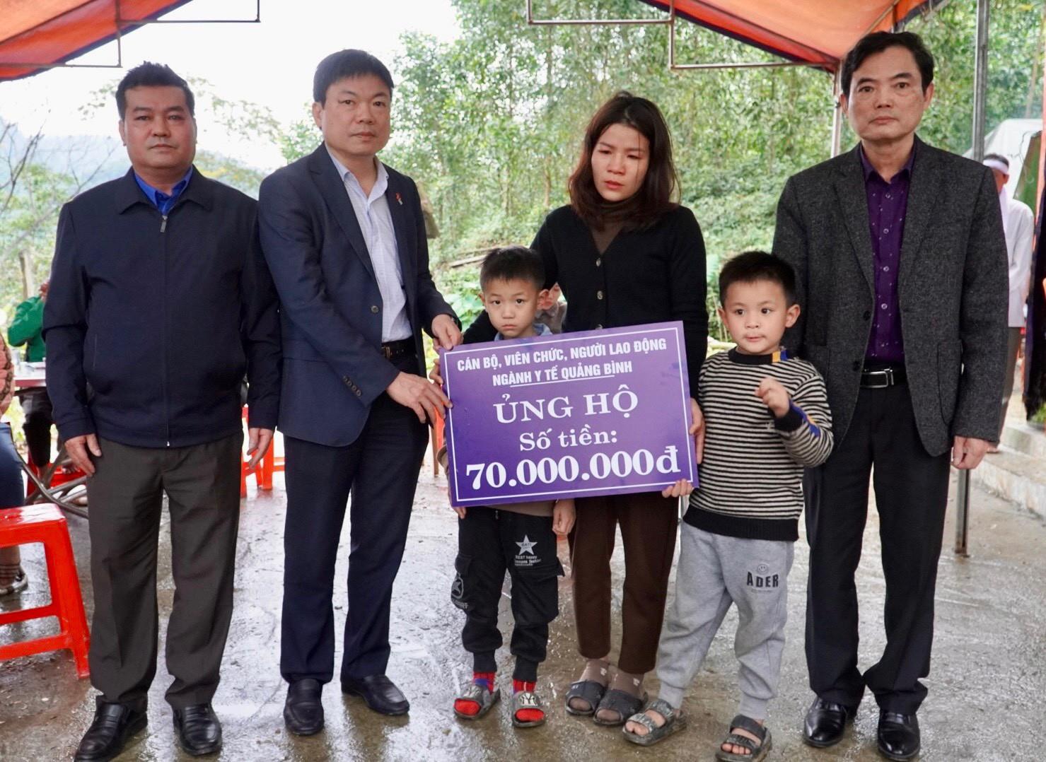 Bác sĩ Dương Thanh Bình - Giám đốc Sở Y tế cùng đại diện Ban thường vụ Công đoàn ngành Y tế trao quà hỗ trợ gia đình Đoàn viên công đoàn Trung tâm y tế huyện Tuyên Hóa gặp khó khăn hoạn nạn.