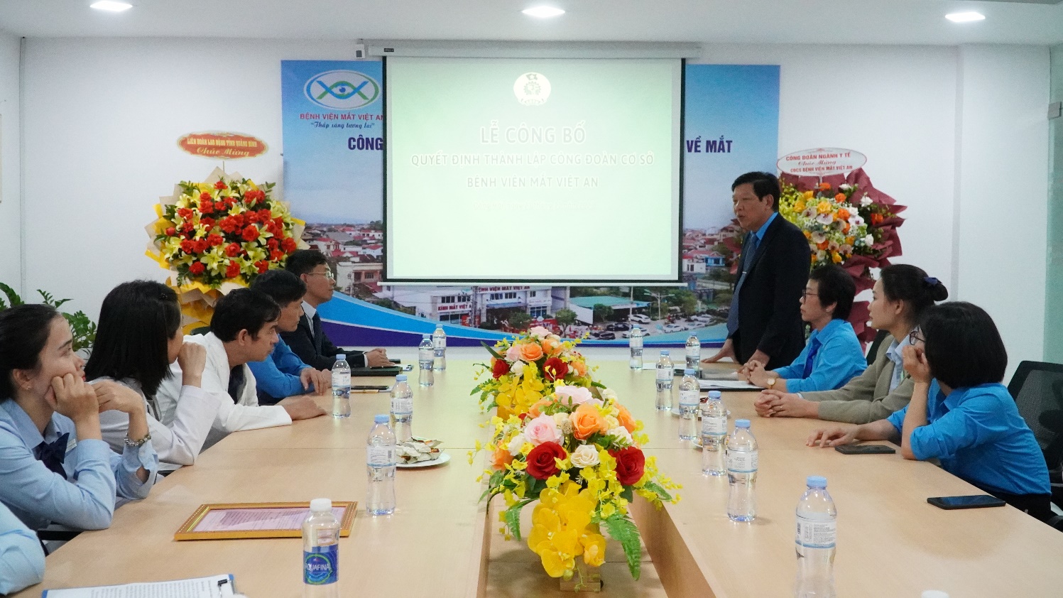 Tại buổi Lễ, đồng chí Phan Thanh Hải, Chủ tịch Công đoàn Ngành Y tế đã đọc và trao quyết định kết nạp 45 đoàn viên Công đoàn; công bố và trao Quyết định thành lập CĐCS Bệnh viện Mắt Việt An, chỉ định Ban Chấp hành lâm thời, đồng thời giao nhiệm vụ cho các đồng chí trong Ban Chấp hành.