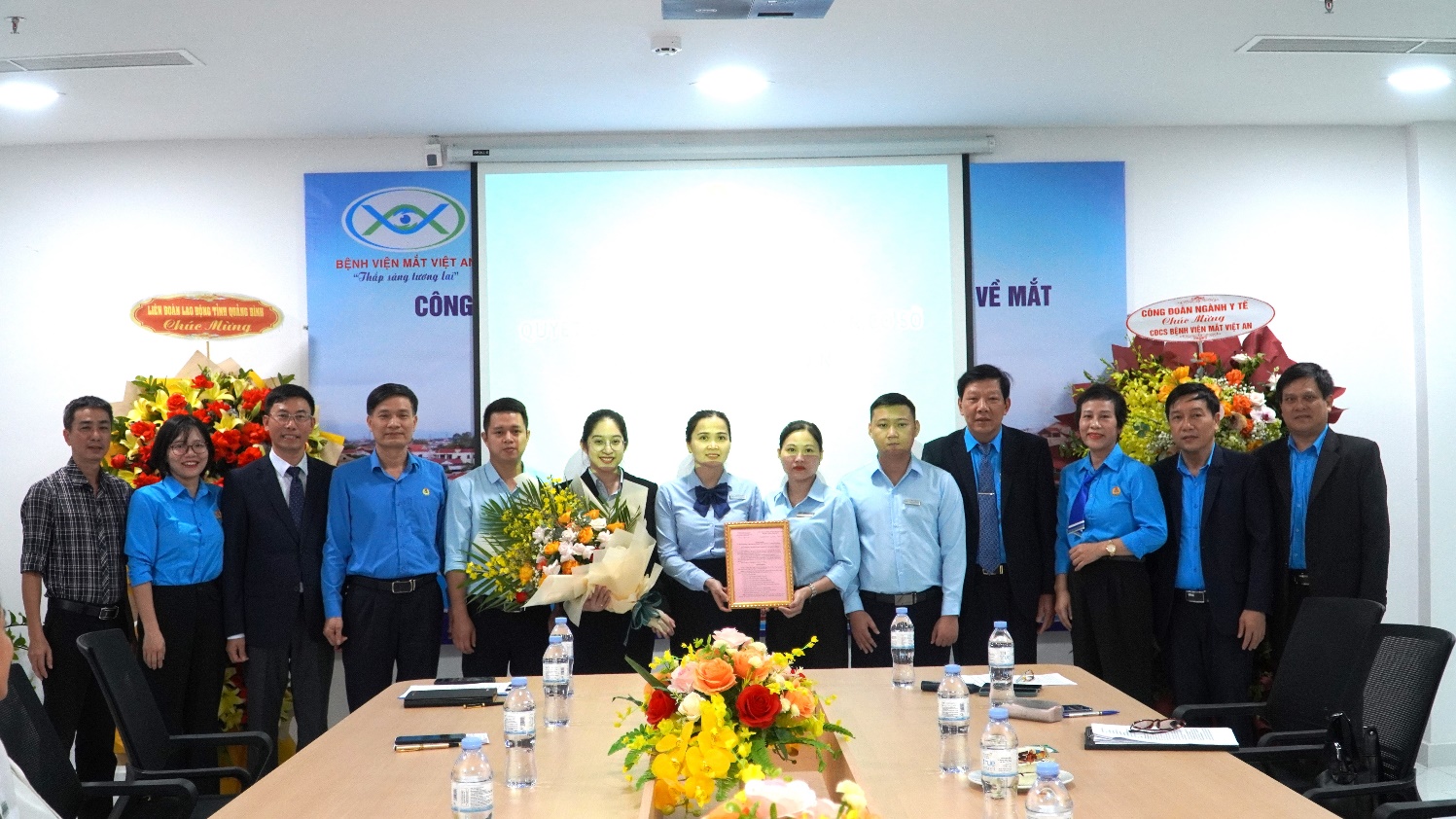 Đại diện Công đoàn Ngành Y tế và đại diện Liên đoàn Lao động tỉnh trao Quyết định thành lập CĐCS Bệnh viện Mắt Việt An