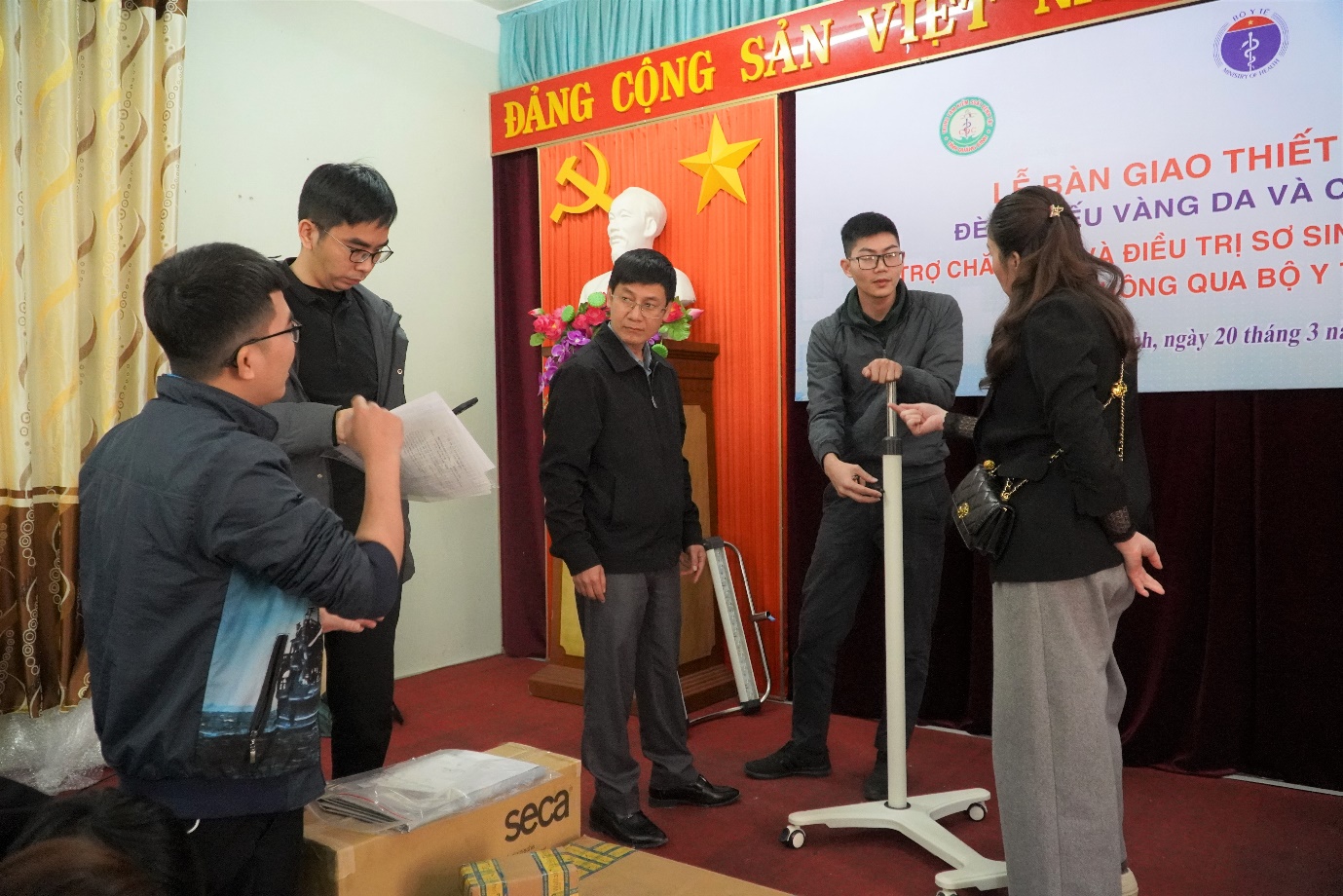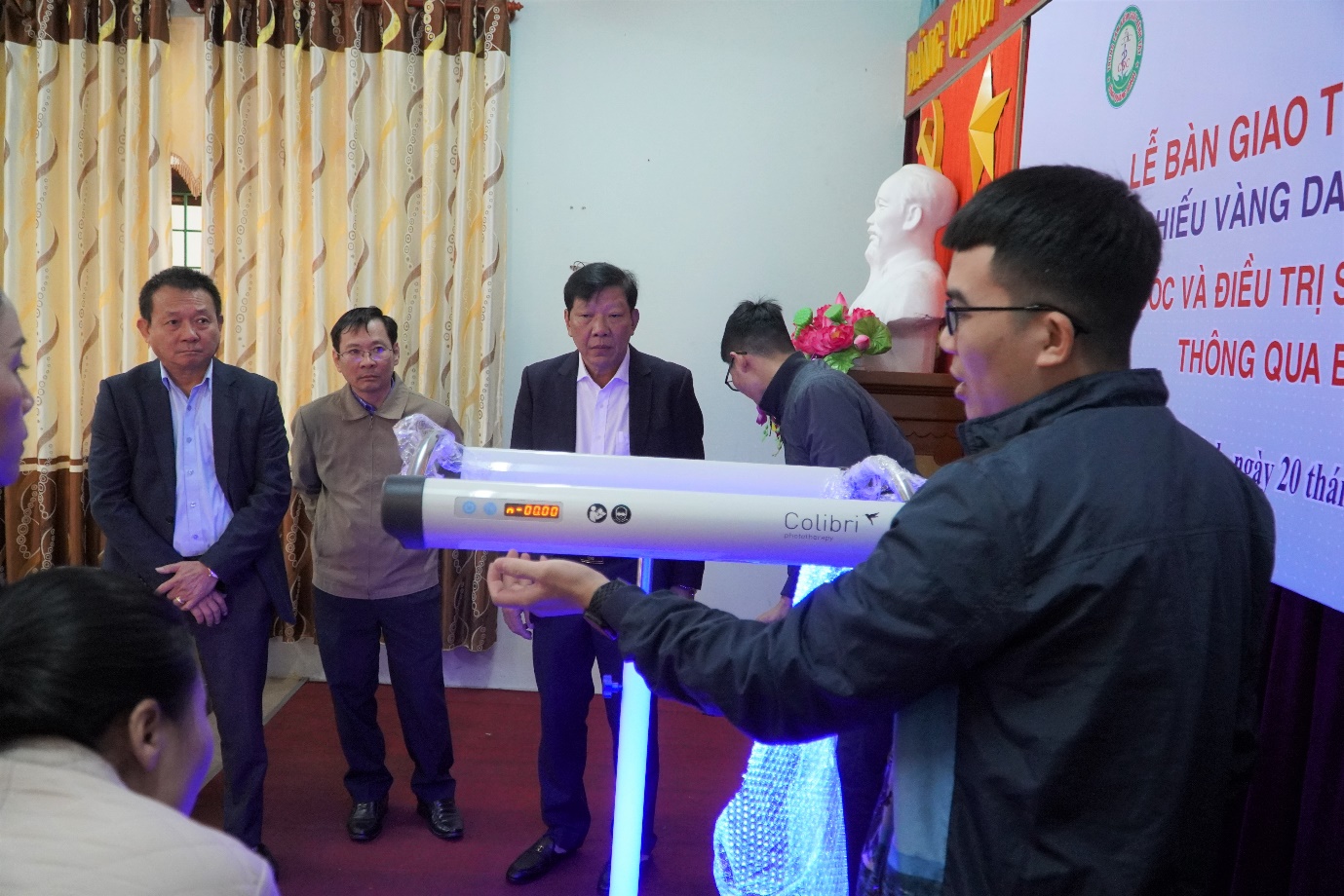 Ngay sau khi bàn giao, cán bộ kỹ thuật đã hướng dẫn lắp, sử dụng và vận hành đèn chiếu vàng da, cân sơ sinh cho cán bộ của các Bệnh viện và Trung tâm Y tế được hỗ trợ.
