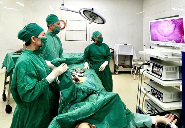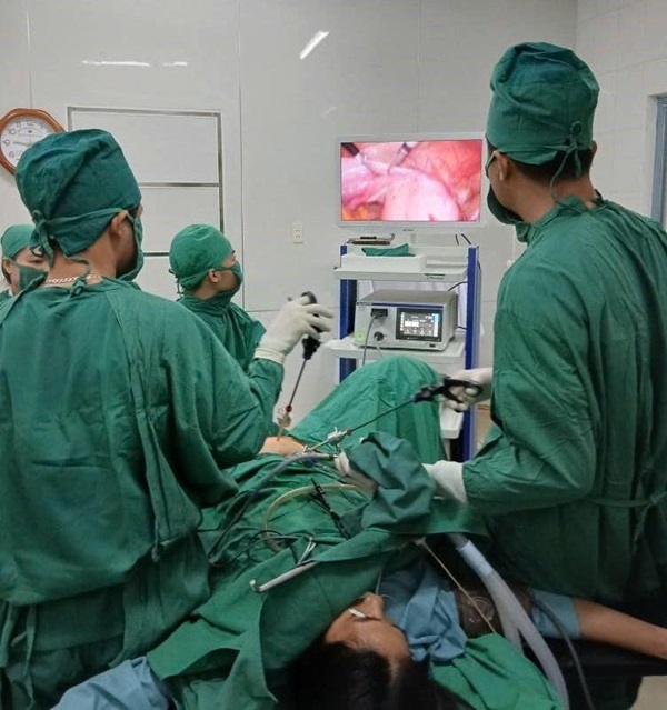 Thầy thuốc khoa Phụ sản phẫu thuật nội soi bóc u nang buồng trứng tại Bệnh viện Đa khoa Khu vực Triệu Hải. Nguồn: BVCC